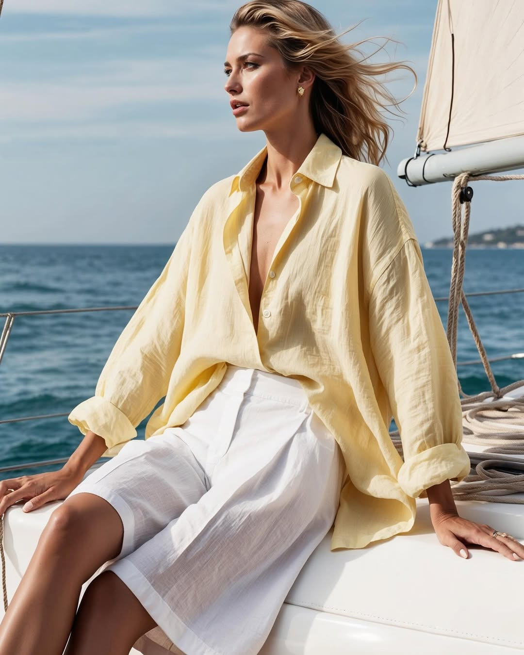 The Solana Relaxed Shirt & Bermuda Set brings vacation ease to everyday sophistication. Crafted from a lightweight woven blend that breathes beautifully, this set pairs an oversized button-up shirt with softly tailored Bermuda shorts for a look that’s polished but completely unfussy. The subtle sheen and pale lemon hue channel nautical elegance with a playful twist—perfect for yacht days, or city strolls.