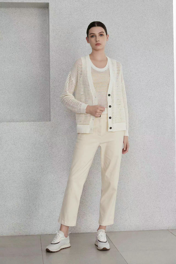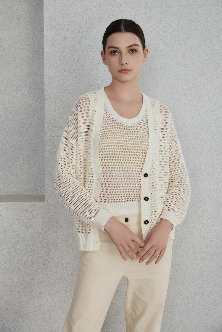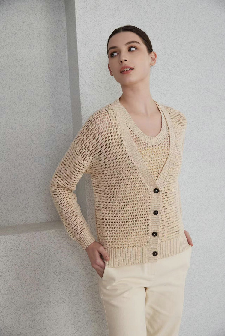 The Liora Knit Cardigan Set — crafted in an airy open-knit with a button-front cardigan layered over a matching knit tank. Designed with subtle texture and a soft drape, it’s a refined yet versatile set made for transitional layering.