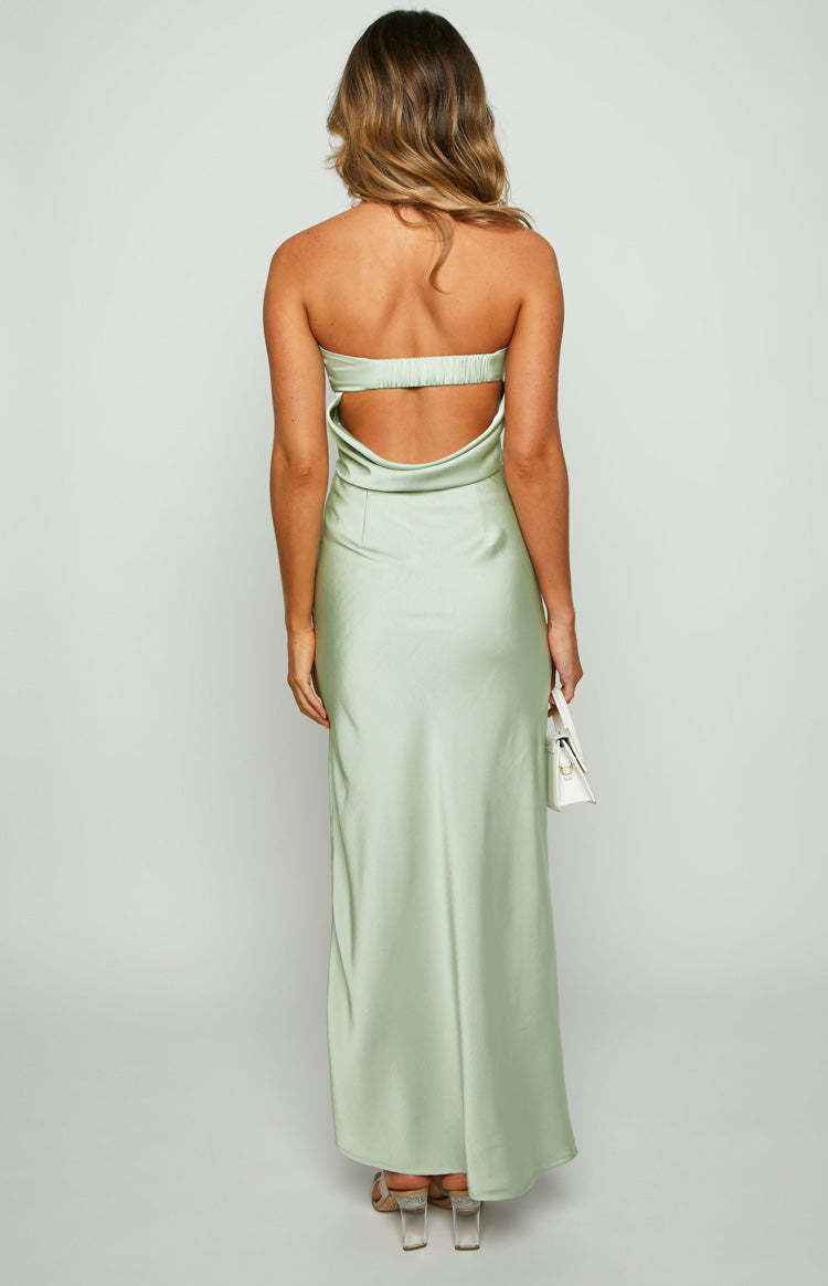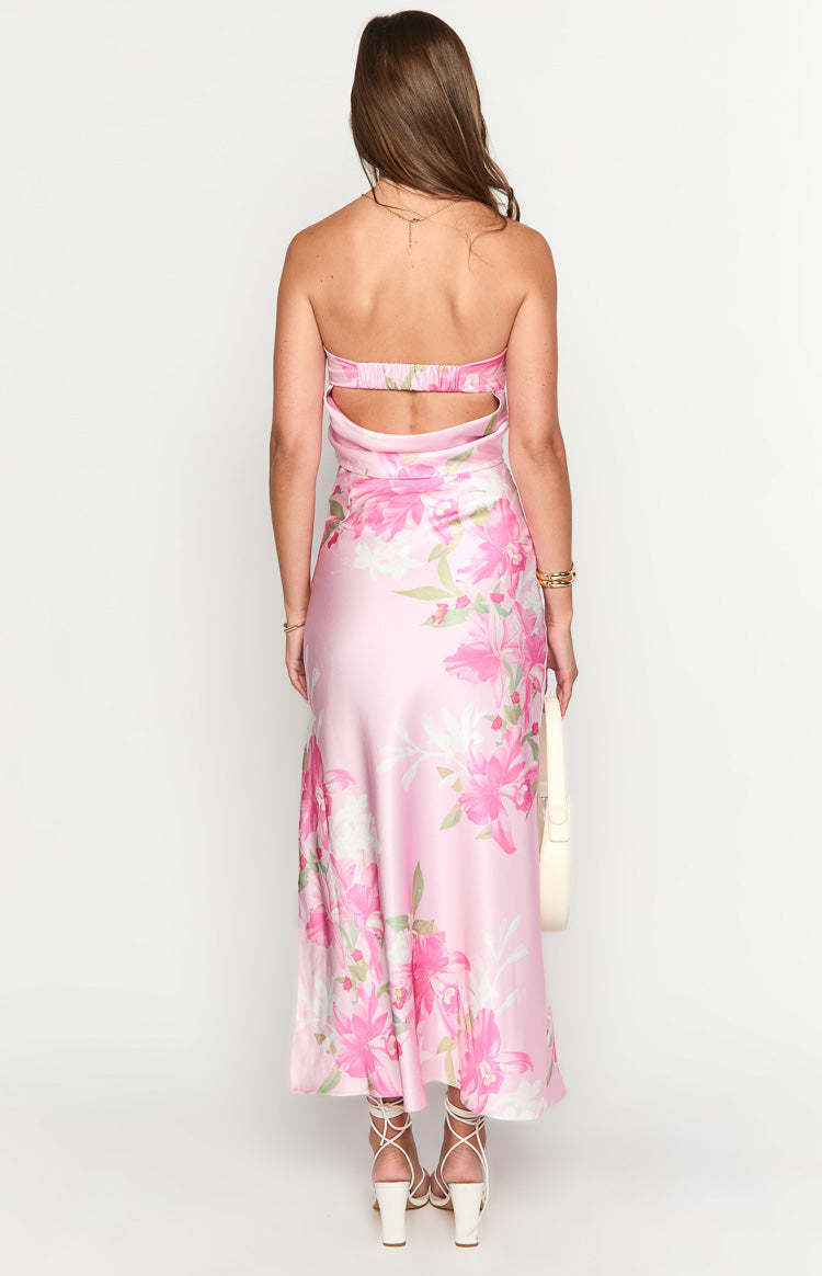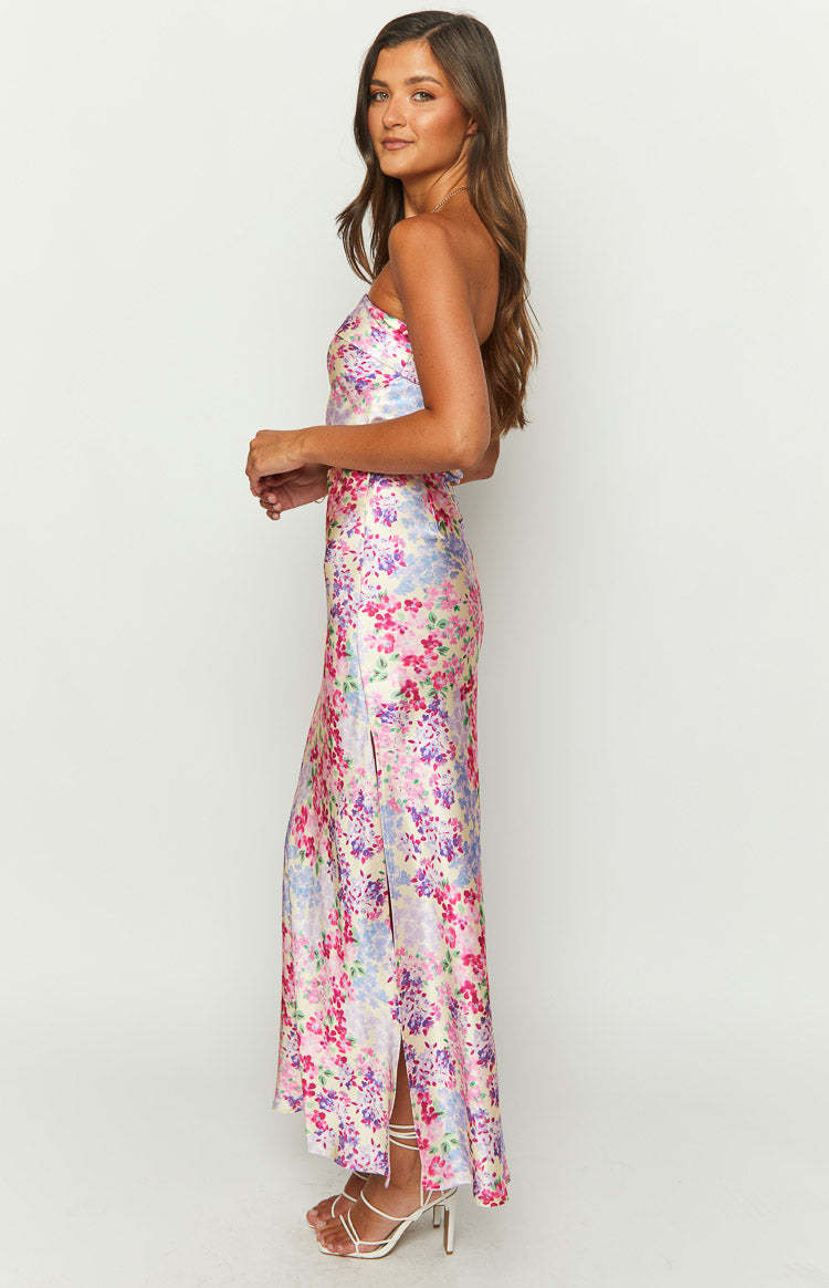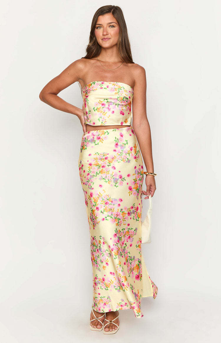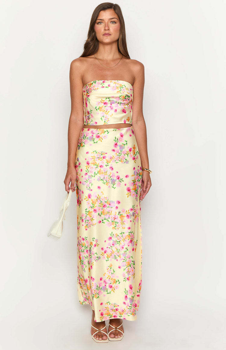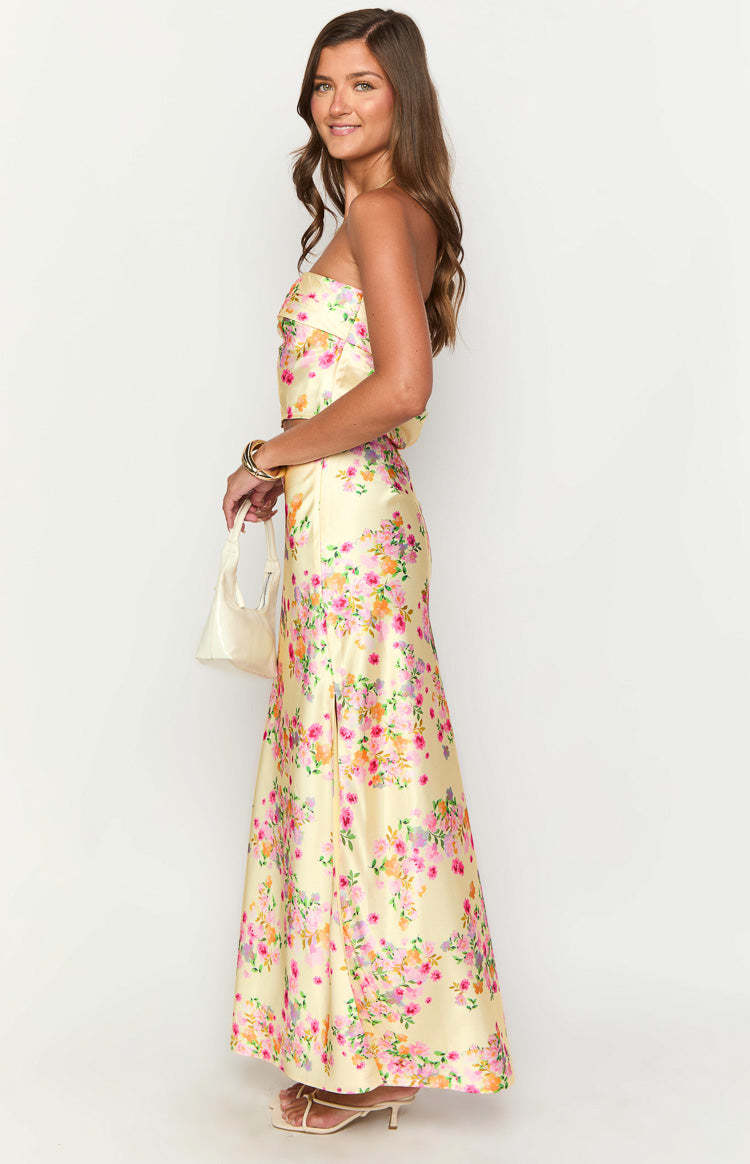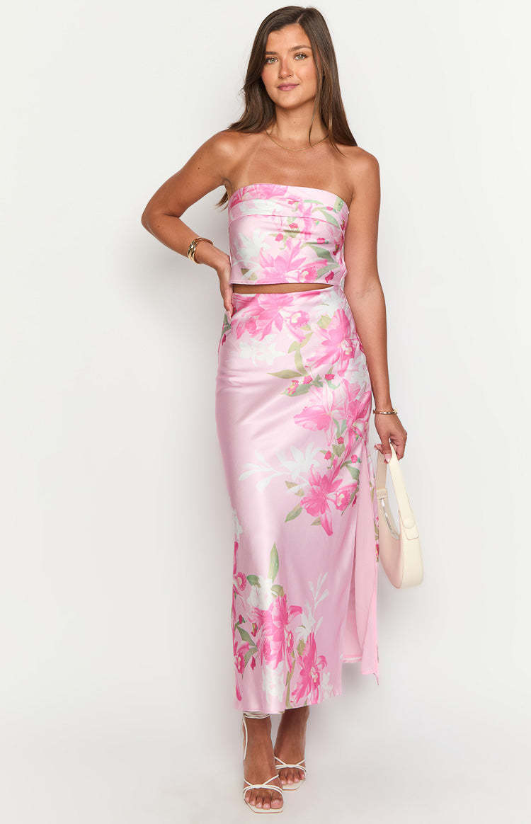 Lightweight, polished, and ready for warm-weather wear. This satin two-piece set features a bandeau-style crop top and a matching high-waisted maxi skirt, designed in a vivid floral print. The smooth fabric and side slit add movement and elegance, while the clean cut keeps it modern and refined.