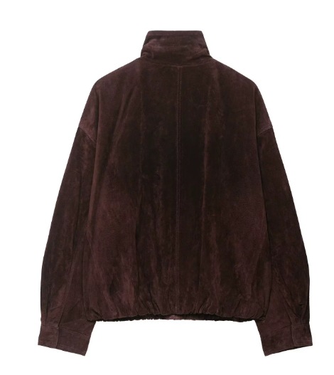The Chocolate Suede Jacket Soft dark brown suede with a structured shape and subtle sheen. Designed with a high collar, concealed front, and elastic hem for a clean finish. A polished outer layer that adds quiet depth to your fall wardrobe.