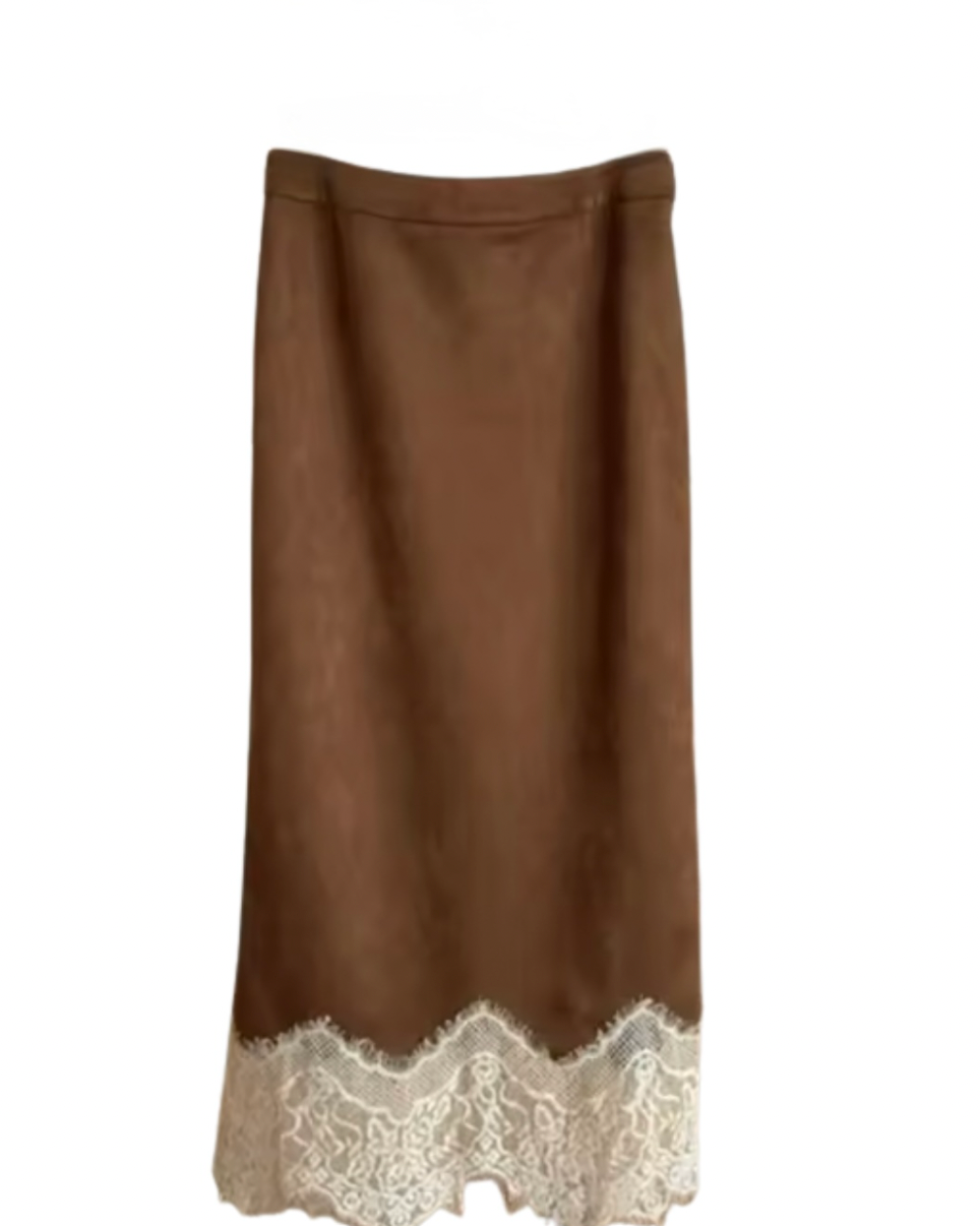 The Suede Lace-Trim Midi Skirt A 100% suede midi skirt featuring a soft finish and scalloped lace hem. Designed with a straight silhouette that blends texture and refinement.